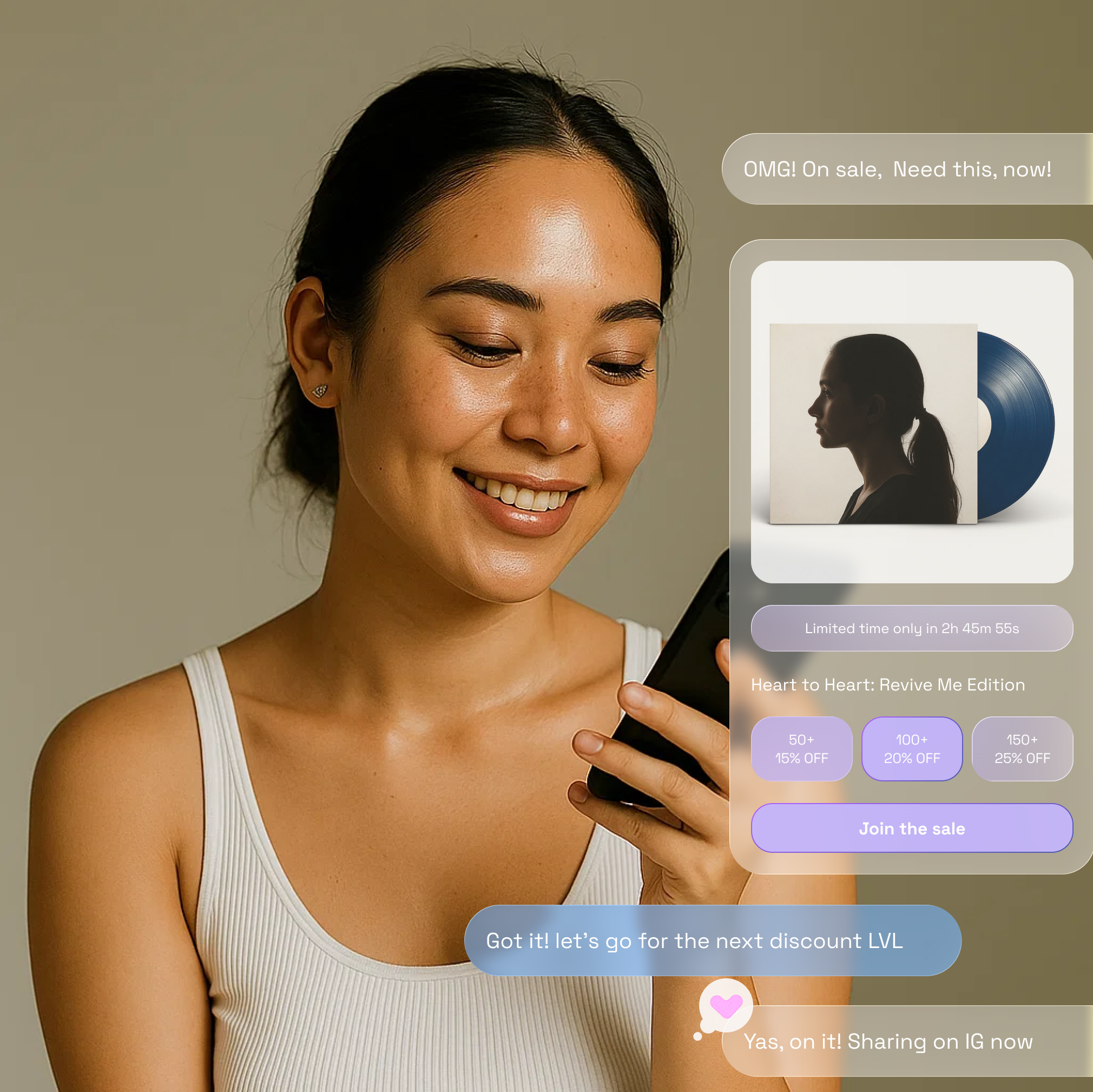 Turn customers into promoters with bigger discounts as more people join the sale. Buyers actively share to unlock the next discount tier, driving viral growth.
